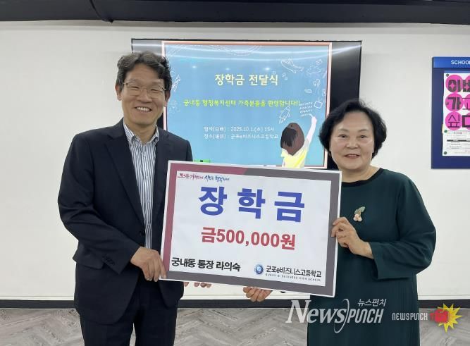 뉴스펀치 탁상훈 기자 | 라의숙 군포시 궁내동통장협의회장은 10월 1일 군포e비즈니스고등학교에 장학금을 전달하며 지역 청소년들의 꿈을 응원하는 뜻깊은 나눔을 실천했다.