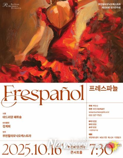 뉴스펀치 탁상훈 기자 | 부천필하모닉오케스트라가 오는 10월 16일 오후 7시 30분 부천아트센터 콘서트홀에서 제330회 정기연주회 '프레스파뇰'를 개최한다. 이번 무대는 프랑스와 북유럽을 대표하는 명곡들을 중심으로, 스페인의 정열과 낭만이 교차하는 다채로운 프로그램으로 꾸며진다. 공연에는 상임지휘자 아드리앙 페뤼숑과 부천필이 무대에 오르며, 협연자로는 제17회 차이콥스키 국제 콩쿠르 기악 부문 한국인 최초 우승자 바이올리니스트 김계희가 함께한다.