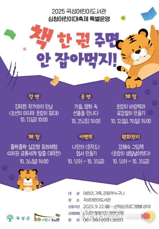 뉴스펀치 김길룡 기자 | 곡성군은 다가오는 제25회 곡성심청어린이대축제를 기념하여 10월 한 달간 곡성어린이도서관에서 지역민과 방문객을 위한 다양한 볼거리와 독서문화 프로그램을 운영한다고 2일 밝혔다.