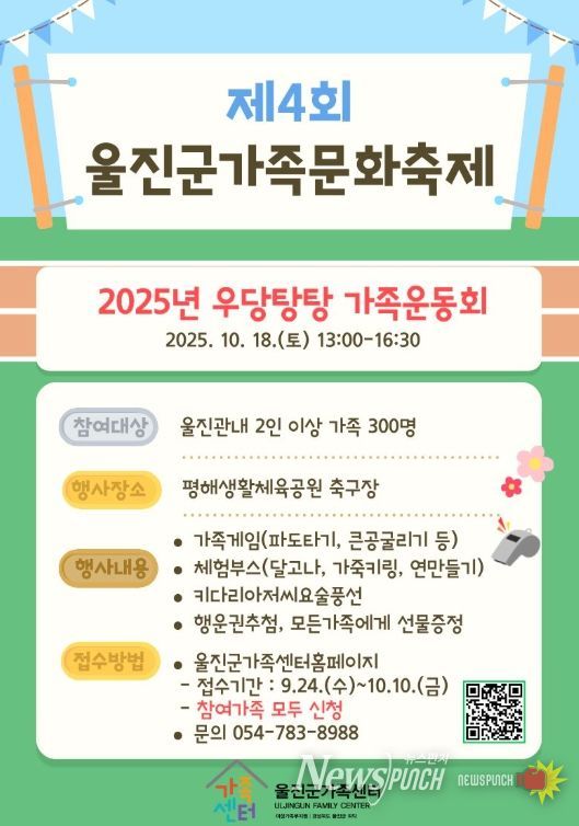 뉴스펀치 김길룡 기자 | 울진군은 울진군가족센터가 오는 10월 18일 오후 1시부터 평해생활체육공원 축구장에서 제4회 울진군가족문화축제‘우당탕탕 가족운동회’를 개최한다.