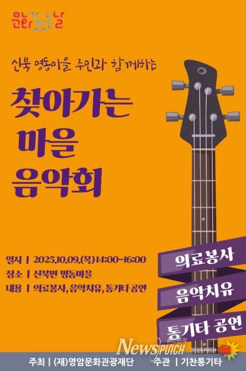 뉴스펀치 김길룡 기자 | (재)영암문화관광재단은 2025 문화가 있는 날 행사지원 사업으로 생활문화 동호회인 기찬통기타(대표:최문일)와 함께 신북 명동마을 주민을 대상으로 한 ‘찾아가는 마을 음악회’를 오는 10월 9일 한글날에 개최한다고 밝혔다.