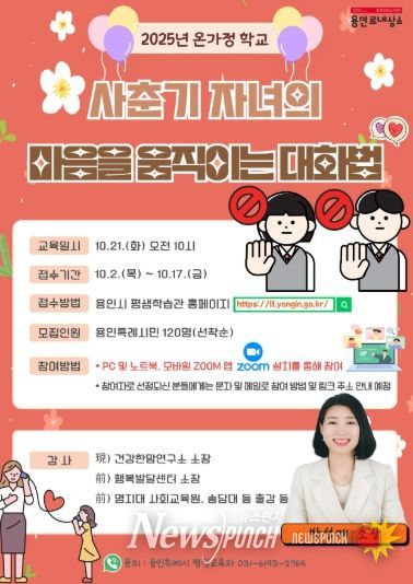 뉴스펀치 탁상훈 기자 | 용인특례시는 ‘사춘기 자녀 마음을 움직이는 대화법’을 주제로 한 ‘2025년 온가정 학교’ 온라인 특강 참가자를 모집한다고 2일 밝혔다.