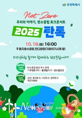 뉴스펀치 김길룡 기자 | 창원특례시는 오는 10월 18일 오후 4시 용지호수공원 탄소제로하우스 앞 잔디광장에서 기후위기 대응과 탄소중립 실천 문화를 확산하기 위해 탄소중립 토크콘서트 ‘2025탄톡’을 개최한다.