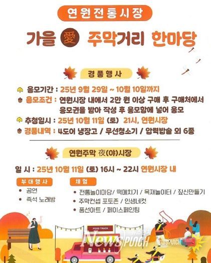 또한 10월 10일까지 연원시장을 이용한 고객을 대상으로 응모권을 배부하고 축제 당일 오후 9시에는 경품 추점 이벤트도 진행될 예정이다.