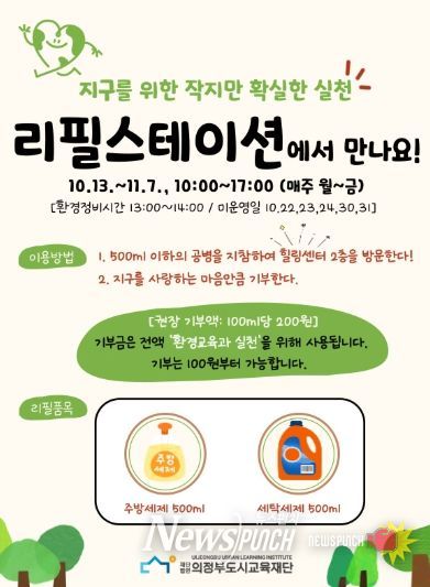 뉴스펀치 탁상훈 기자 | (재)의정부도시교육재단은 10월 13일부터 11월 7일까지 매주 월요일부터 금요일, 오전 10시부터 오후 5시까지 힐링센터 2층에서 생활 속 친환경 실천 활동 ‘리필스테이션’을 운영한다.