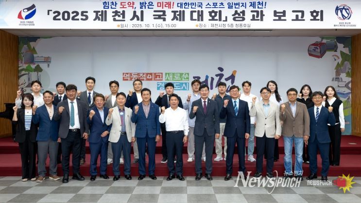 뉴스펀치 김길룡 기자 | 제천시는 지난 1일 제천시청 5층 청풍호실에서 '2025년 제천시 국제대회'성과보고회를 개최했다. 보고회에는 김창규 제천시장, 박영기 제천시의회 의장, 김경석 대한롤러스포츠연맹 회장(이상 공동조직위원장), 장재돈 대한체조협회 고문과 안성국 제천시체육회장(집행위원장), 오재성 제천시체조협회장, 최호열 제천시롤러스포츠연맹회장(이상 공동 사무총장) 및 유관기관, 단체장 3명과 종목단체 임원 및 회원 50여 명이 참석했다.