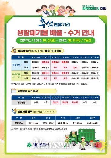 뉴스펀치 김길룡 기자 | 대전시는 민족 최대 명절인 추석을 맞아 시민들이 쾌적한 환경에서 연휴를 보낼 수 있도록 생활쓰레기 관리대책을 마련해 시행한다고 2일 밝혔다.