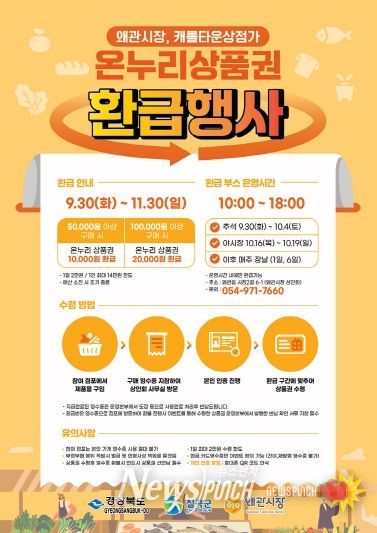 뉴스펀치 김길룡 기자 | 칠곡군은 전통시장 활성화와 지역경제 활력 제고를 위해 9월 30일(화)부터 11월 30일(일)까지 전통시장 구매 고객을 대상으로 온누리상품권 환급행사를 진행한다.