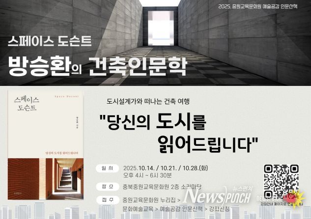 뉴스펀치 김길룡 기자 | 충청북도교육청 직속기관 중원교육문화원(원장 배상근)은 교육공동체 구성원들의 인문적 소양과 예술적 감수성을 높이기 위해 운영중인 문화교육 프로그램 '예술공감 인문산책'의 10월 강연 수강생을 선착순 모집한다고 전했다.
