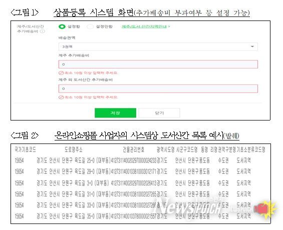 이에 따라, 공정위는 주요 6개 택배사 및 18개 온라인쇼핑몰에 대한 추가배송비 부과 실태 점검을 실시했으며, 그 결과 13개 온라인쇼핑몰 사업자가 ‘도서’와 우편번호가 동일한 일부 ‘연륙도서’로 상품을 주문하는 소비자에게 추가배송비가 자동 부과되도록 시스템을 운영하여, 해당 시스템을 이용하는 온라인쇼핑몰 사업자 자신(직접 통신판매업 운영) 또는 입점업체(이하 ‘입점업체 등’)가 택배사로부터 추가배송비를 부과 받지 않았음에도 일부 연륙도서 소비자에게 추가배송비가 부과되고 있었음이 확인됐다.