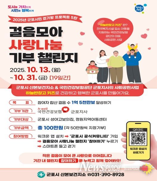 뉴스펀치 탁상훈 기자 | 군포시 산본보건지소는 오는 10월 13일부터 31일까지(19일간) 국민건강보험공단 군포지사와 함께하는 '걸음모아 사랑나눔' 기부챌린지를 운영한다.