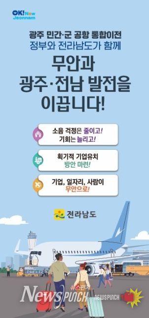 뉴스펀치 김길룡 기자 | 전라남도는 전남·광주·무안의 상생과 도민의 오랜 염원을 이루기 위해 광주 민간·군 공항의 무안국제공항 통합이전을 ‘더 이상 미룰 수 없는 시대적 과제’로 규정하고 강력히 추진할 계획이라고 밝혔다.