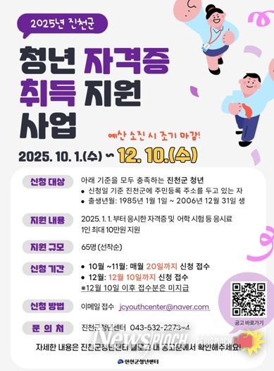 단, 운전면허시험은 지원 대상에서 제외되며, 기타 자세한 내용과 신청 방법은 진천군 청년센터 공식 블로그와 SNS(인스타) 채널을 통해 확인할 수 있다.