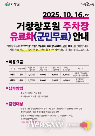 뉴스펀치 김길룡 기자 | 거창군은 거창창포원 운영 유지비를 일부 충당하고, 국가정원 승격을 위한 기반 조성을 위해 2025년 10월 16일부터 주차장을 유료화한다고 밝혔다.