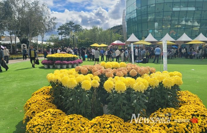 뉴스펀치 김길룡 기자 | 가을 연휴 기간 내린 비가 그친 뒤, 2025 제천국제한방천연물산업엑스포 광장이 화사한 꽃물결로 물들었다.