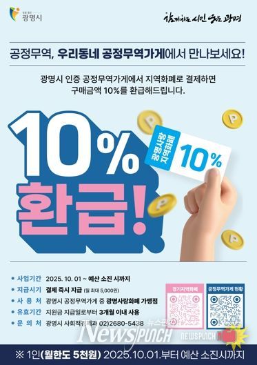 뉴스펀치 탁상훈 기자 | 광명시가 공정무역가게에서 광명사랑화폐(지역화폐)로 결제하면 결제금액의 10%를 돌려주는 ‘공정무역 실천 캐시백’ 행사를 진행한다고 9일 밝혔다.