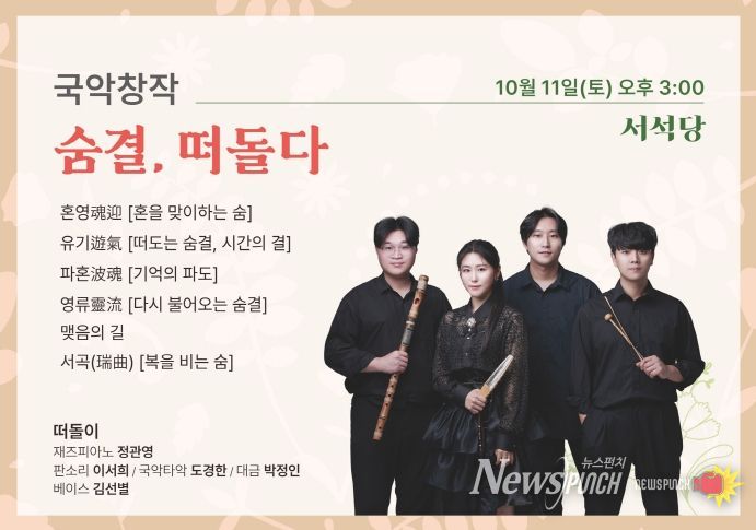 뉴스펀치 탁상훈 기자 | 광주문화재단(대표이사 노희용) 전통문화관은 오는 10월 11일 오후 3시, 토요 상설공연 22회차로 퓨전국악 단체 떠돌이의 '숨결, 떠돌다' 무대를 선보인다.