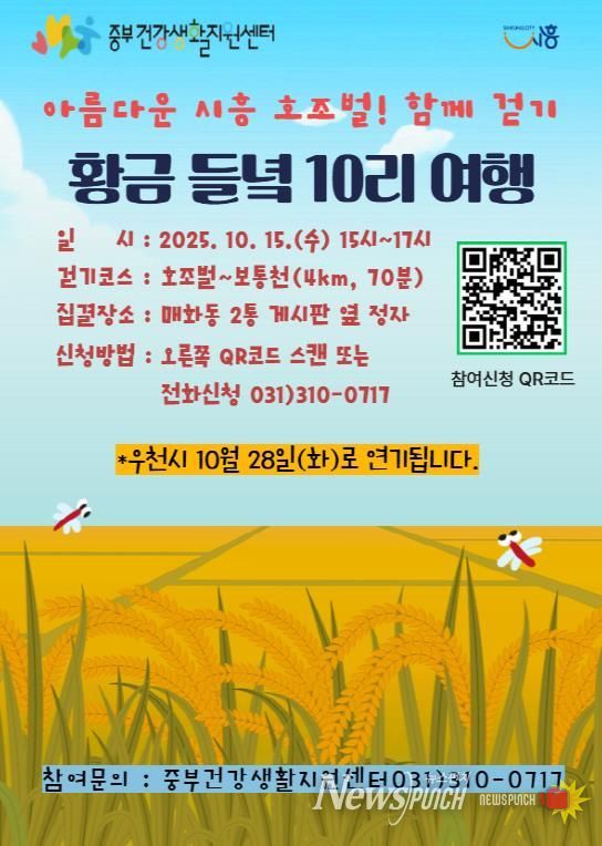 뉴스펀치 탁상훈 기자 | 시흥시는 오는 10월 15일 오후 3시부터 5시까지 호조벌 일대에서 ‘황금 들녘 10리 여행 걷기 행사’를 연다.