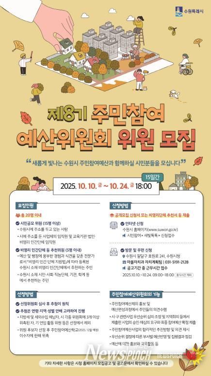 뉴스펀치 탁상훈 기자 | 수원특례시는 10월 24일까지 제8기 주민참여예산위원회 위원을 공개 모집한다.