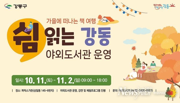 뉴스펀치 김완규 기자 | 강동구는 10월 11일부터 11월 2일까지 한 달간 파믹스가든(상일동 145-6)에서 주말 야외 도서관 '쉼 읽는 강동'을 운영한다고 밝혔다.