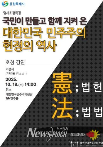 뉴스펀치 김길룡 기자 | 창원특례시는 오는 10월 18일 오후 2시, 대한민국민주주의전당 민주홀에서 ‘대한민국 민주주의 헌정의 역사’ 특별 강연을 개최한다고 밝혔다.