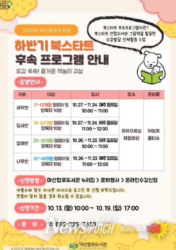 뉴스펀치 김길룡 기자 | 창원특례시 마산합포도서관(과장 정진성)에서는 영유아의 오감 발달에 도움이 되는 북스타트 후속 프로그램을 10월 26일부터 11월 24일까지 운영한다.