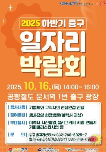 뉴스펀치 탁상훈 기자 | 인천시 중구는 오는 16일 공항철도 운서역 1번 출구 앞 광장에서 ‘2025 하반기 중구 일자리 박람회’를 개최한다고 밝혔다.