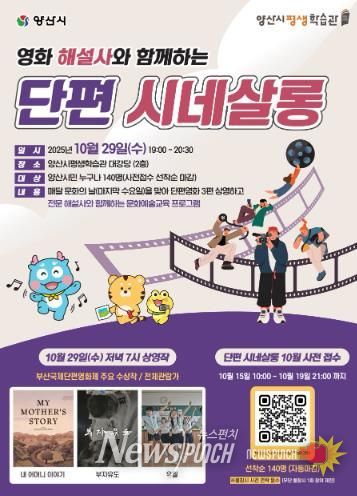 뉴스펀치 김길룡 기자 | 양산시평생학습관은 매월 마지막 수요일 ‘문화가 있는 날’을 맞아 단편영화 상영과 전문 해설이 함께하는 문화예술교육 프로그램'단편 시네살롱'을 운영한다고 밝혔다.