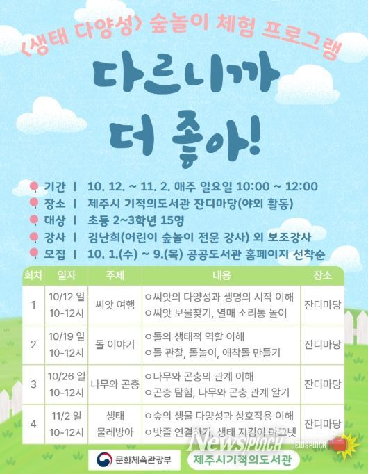 뉴스펀치 김길룡 기자 | 제주시 기적의도서관은 ‘2025년 다문화 서비스 지원사업’의 일환으로 10월 프로그램인 ‘생태 다양성: 다르니까 더 좋아!’와 ‘문화 다양성: 달라서 좋아, 함께해서 좋아!’를 운영한다.