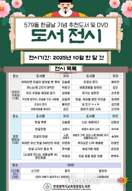 뉴스펀치 탁상훈 기자 | 인천광역시교육청중앙도서관은 한글 창제 579돌을 기념해 10월 한 달 동안 ‘한글날 추천 도서 및 DVD’ 전시를 운영한다.