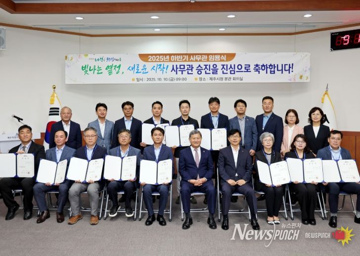 뉴스펀치 김길룡 기자 | 제주시는 2025년 10월 3일자 사무관 승진 임용자 11명에 대해서 10월 10일 제주시청 본관 회의실에서 임용장 수여식을 개최했다.