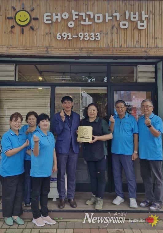 뉴스펀치 탁상훈 기자 | 평택시 팽성읍 지역사회보장협의체는 지난 2일, 나눔 활동에 동참한 ‘태양꼬마김밥’에 ‘착한 이웃’ 현판을 전달했다.