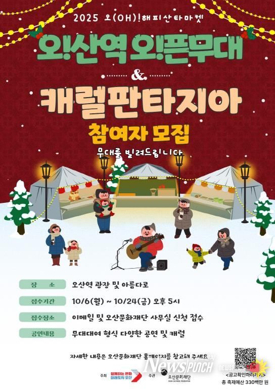 뉴스펀치 탁상훈 기자 | (재)오산문화재단은 겨울 대표 축제인 ‘2025 오(oh)! 해피산타마켓’을 맞아 특별 프로그램 ‘오!산역 오!픈무대’와 ‘캐럴 판타지아’**의 참가자를 모집한다고 10일 밝혔다. 이번 프로그램은 시민이 직접 참여하는 열린 문화 무대로 운영되어 축제 현장의 활기를 더하고 지역 예술문화 활성화에 기여할 예정이다.