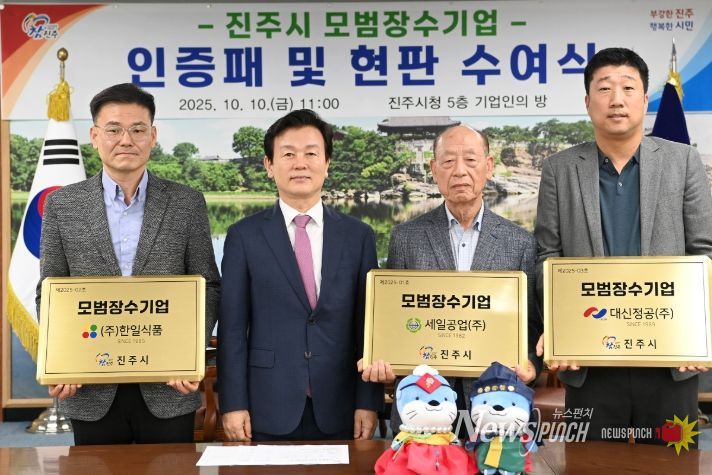 뉴스펀치 김길룡 기자 | 진주시는 10일 시청 기업인의 방에서 올해 모범장수기업으로 선정된 세일공업(주), ㈜한일식품, 대신정공(주)에 인증패와 현판을 수여했다.