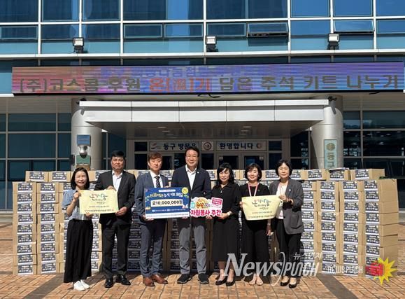뉴스펀치 김길룡 기자 | (사)부산광역시 동구자원봉사센터는 지난 10월 1일 동구청 광장에서 ㈜코스콤(대표 윤창현)의 후원으로 ‘온(溫)기담은 추석키트 전달’을 진행했다고 밝혔다.