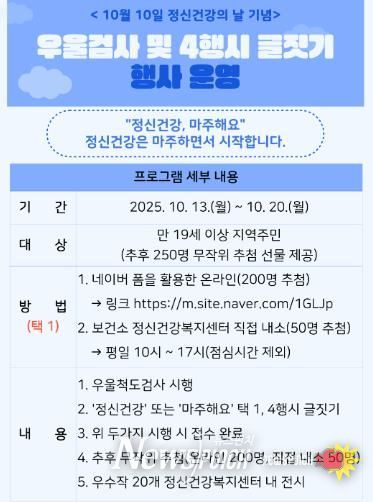 이번 행사는 만 19세 이상 지역 주민을 대상으로 진행되며, 우울감 조기 발견과 긍정적인 정신건강 메시지 확산을 위해 기획됐다.