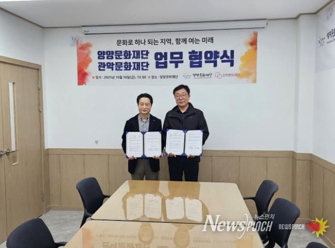 뉴스펀치 김길룡 기자 | 양양문화재단과 관악문화재단은 10일 ‘문화예술 발전 및 교류 활성화 협력체계 구축’을 위해 업무협약을 체결했다.