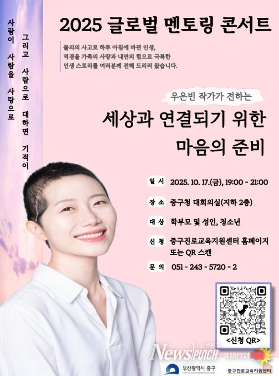 뉴스펀치 김길룡 기자 | 부산 중구는 중구 진로교육지원센터 주관으로 오는 10월 17일 오후 7시, 중구청 지하2층 대회의실에서 '2025 글로벌 멘토링 콘서트'를 개최한다.