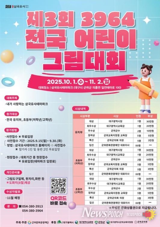 뉴스펀치 김길룡 기자 | 군위문화관광재단은 10월 1일부터 11월 2일까지 한달 간 삼국유사테마파크에서 '제3회 3964 전국 어린이 그림대회'를 진행하고 있다.