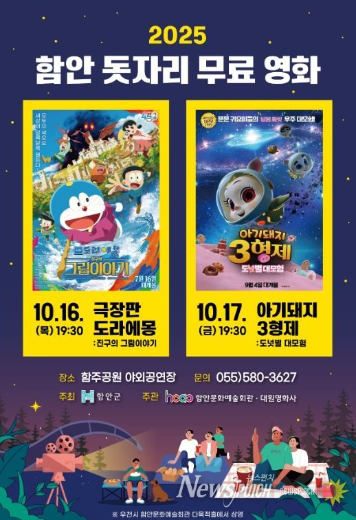 뉴스펀치 김길룡 기자 | 함안문화예술회관은 군민에게 영상문화를 즐길 기회를 제공하기 위해 10월 16일과 17일 오후 7시 30분 함주공원 야외공연장에서 ‘함안 돗자리 무료영화’를 운영한다고 밝혔다.