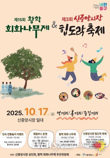 뉴스펀치 김완규 기자 | 서울 중구 황학동의 오랜 전통을 품은‘황학회화나무제’와 젊은 감각이 살아 있는‘신중앙시장 힙도락(HIP:道樂) 축제’가 오는 17일 오후 2시에 함께 열린다. 두 축제는 2023년부터 연계 개최해, 황학동의 가을을 더욱 풍성히 채우고 있다.