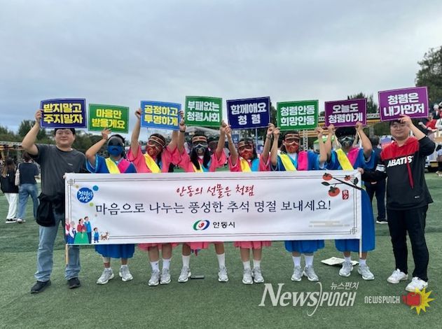 이번 캠페인은 10월 4일 안동탈춤축제장에서 ‘안동의 선물은 청렴, 마음으로 나누는 풍성한 추석 명절 보내세요’라는 슬로건 아래 진행됐으며, 시민과 공직자가 함께 청렴 실천을 다짐하는 퍼포먼스를 통해 청렴문화 확산에 앞장섰다.