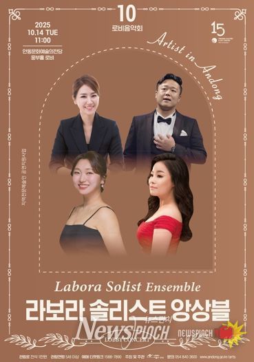 뉴스펀치 김길룡 기자 | 안동문화예술의전당은 지역예술인들에게 다양한 무대 경험을 제공하고, 시민에게는 일상 속 음악 향유의 기회를 선사하기 위해 매월 첫째 주 화요일 오전 11시 로비음악회 시리즈를 진행하고 있다. 오는 10월 14일 오전 11시, '라보라 솔리스트 앙상블'이 안동문화예술의전당 웅부홀 로비에서 열린다.