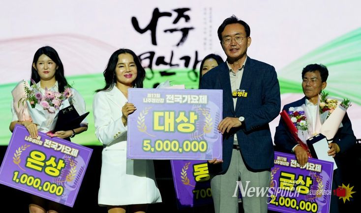 뉴스펀치 김길룡 기자 | ‘2025 나주영산강축제’ 국민참여 프로그램중 하나인 ‘제17회 나주 영산강 전국 가요제’에서 천년학(김용림)을 열창한 장성희 씨(광주광역시)가 영예의 대상을 차지해 부상으로 상금 500만 원을 수여 받았다.