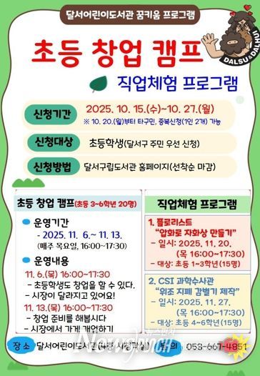 뉴스펀치 조평훈 기자 | 대구 달서구는 초등학생들의 창의적 사고력과 진로 탐색 능력을 키우기 위해 오는 11월 ‘꿈 키움 체험 프로그램’을 운영하고, 10월 15일부터 27일까지 참가자를 모집한다.