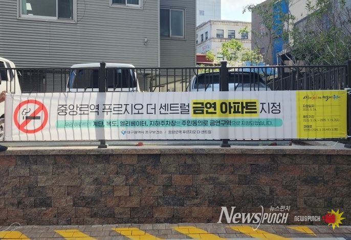 뉴스펀치 조평훈 기자 | 대구 중구는 공동생활공간 내 간접흡연으로부터 주민 건강을 보호하고 쾌적한 금연 환경을 조성하기 위해 ‘대구역 센트럴 대원칸타빌’(태평로 224)과 ‘중앙로역 푸르지오 더 센트럴’(서성로 60)을 각각 제24호, 제25호 공동주택 금연구역으로 지정했다.