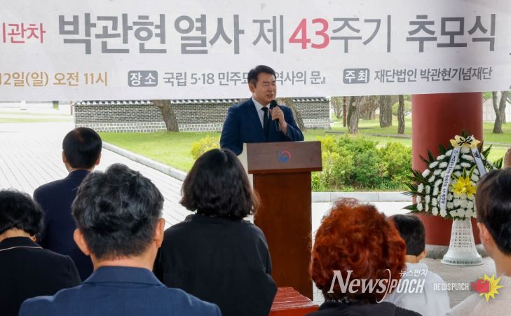 뉴스펀치 김길룡 기자 | 이정선 광주시교육감이 12일 국립5·18민주묘지 ‘역사의 문’ 앞에서 열린 ‘민주화의 새벽기관차 박관현 열사 제43주기 추모식’에 참석했다.