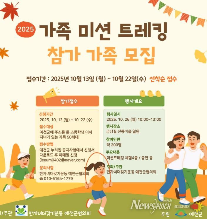 뉴스펀치 김길룡 기자 | 예천군과 한자녀더갖기운동 예천군협의회는 22일까지 ‘가족 미션 트레킹’ 참가 가족을 선착순 모집한다.
