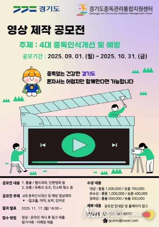 뉴스펀치 탁상훈 기자 | 경기도와 경기도중독관리통합지원센터가 ‘2025년 중독예방 영상 공모전’을 개최한다. 이번 공모전은 전 도민을 대상으로 알코올, 마약, 도박, 인터넷 4대 중독에 대한 위험성과 경각심을 높이고 예방 문화를 확산하기 위해 마련됐다.