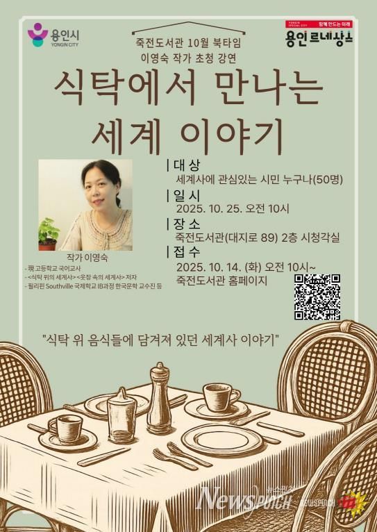 뉴스펀치 탁상훈 기자 | 용인특례시는 25일 오전 10시 죽전도서관 시청각실에서 죽전도서관 북타임 작가초청강연회 ‘식탁에서 만나는 세계 이야기’를 연다고 13일 밝혔다.